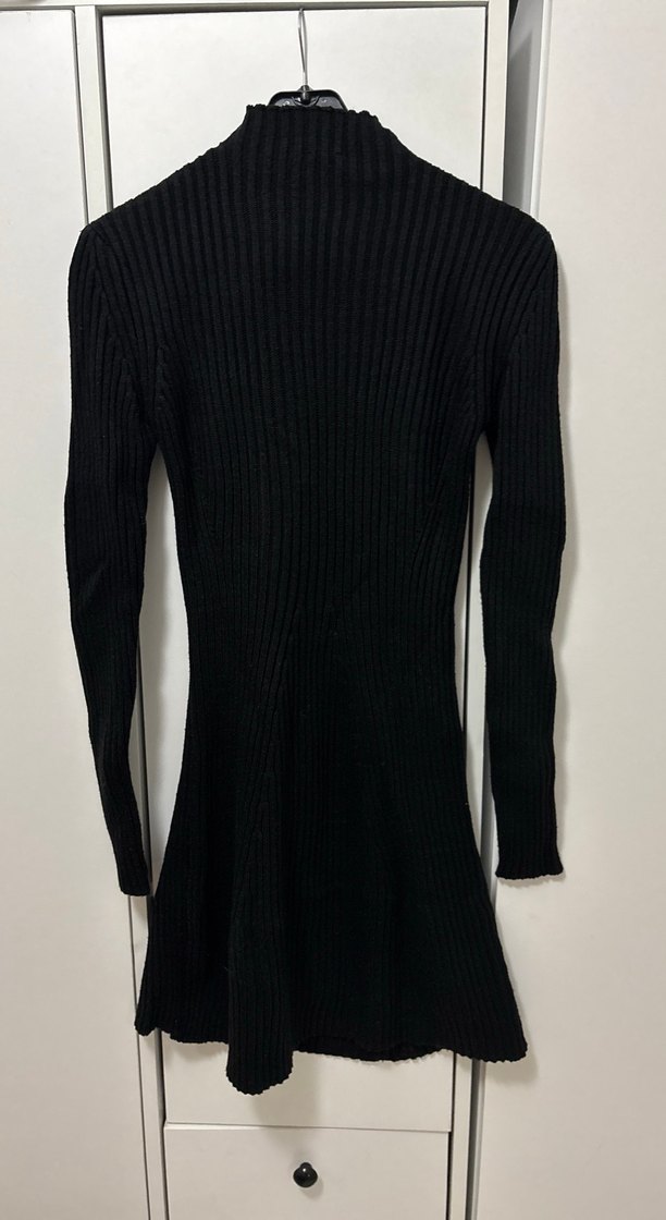 Siyah triko kumaştan, yüksek yakalı ve uzun kollu, vücuda oturan midi boy elbise. Minimalist gotik tarzıyla günlük kullanıma uygun.