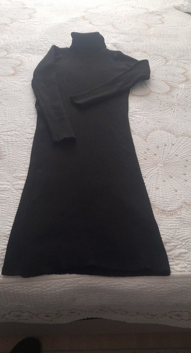 Siyah, yüksek yakalı, uzun kollu triko elbise, rahat ve şık bir görünüm sunar. Düz desensiz yapısıyla gotik stile uygundur.