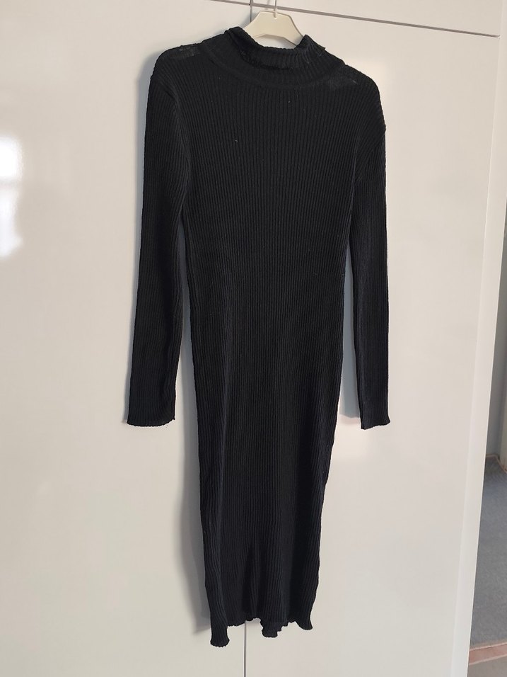 Yüksek yakalı, uzun ve deri dokulu, siyah renkli dar kesim kadın triko elbise. Minimalist ve gotik tarzıyla günlük kullanım için şık ve rahat bir seçim.