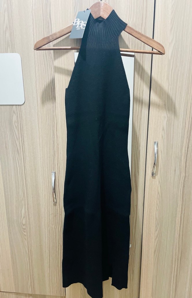 S-M UYUMLU Siyah uzun elbise, yüksek yakalı, kolsuz ve vücuda oturan kesimlidir. Dökümlü detaylı ve yumuşak sentetik kumaştan üretilmiştir.