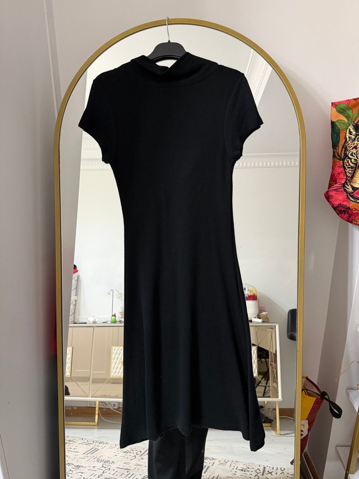Siyah, yüksek yakalı ve kısa kollu, ince kesimli bu uzun elbise, ipeksi kumaştan yapılmıştır. Ofis veya minimalist goth tarzına uygun, zahmetsiz şıklık sunar.
