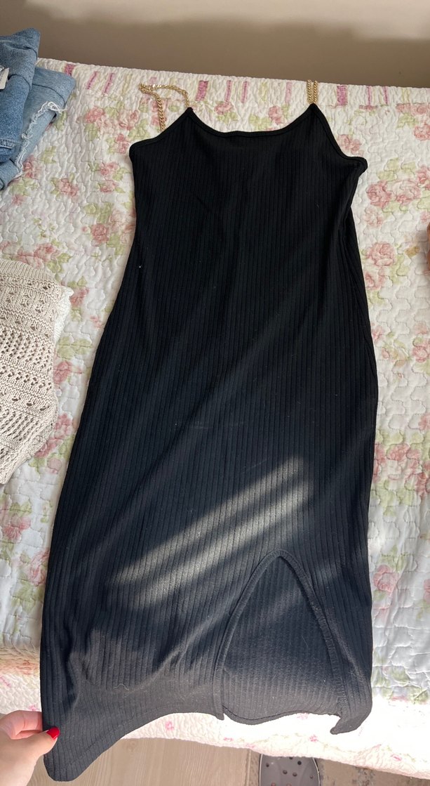 Siyah, yüksek yakalı, kolsuz ve drapeli detaylı uzun elbise. Pürüzsüz sentetik kumaştan, minimalist ve trend günlük tarz için uygun.
