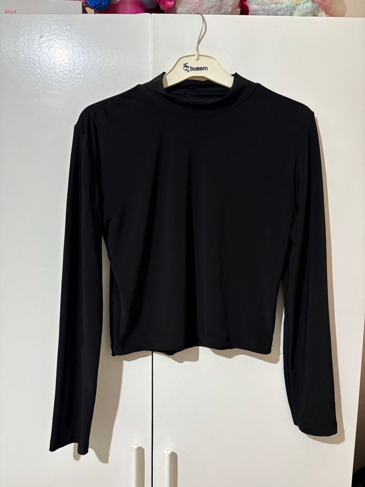 Yüksek yakalı, uzun kollu, siyah crop top. Düz, sentetik kumaştan, günlük athleisure ve sokak stiline uygun şık parça.