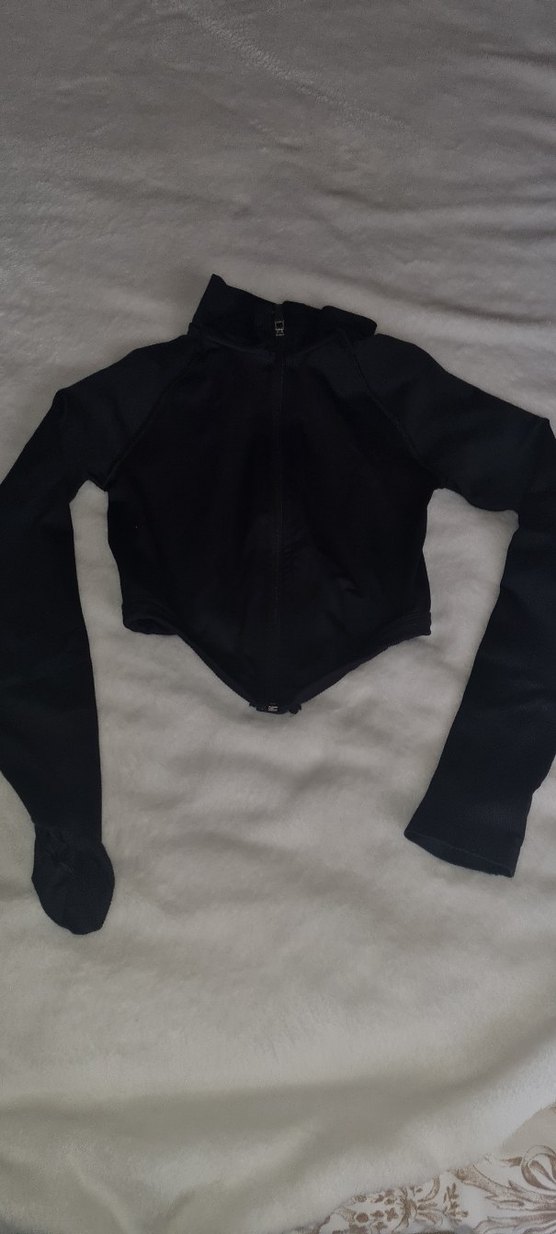 Uzun kollu ve yüksek yakalı, siyah renkli, spor kumaştan yapılmış dar kesim kadın üstt. Midi boyda, desen içermeyen şık goth athleisure tarzı. Günlük kullanım için uygun. Baş parmak eldiven kol.