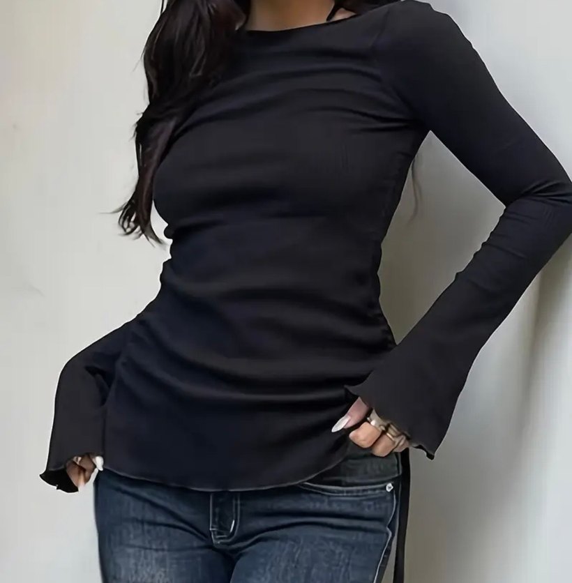 Siyah, yüksek yakalı ve uzun kollu, vücuda oturan, ipeksi dokulu günlük kullanım için şık bir kadın bluzudur. Kalıbı dar k kadar büyük degıl