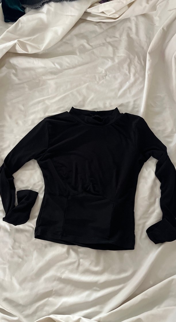 Siyah, yüksek yakalı ve uzun kollu kadın bluz, vücuda oturan kesimiyle günlük kullanıma uygun sade ve şık bir tasarıma sahiptir.
