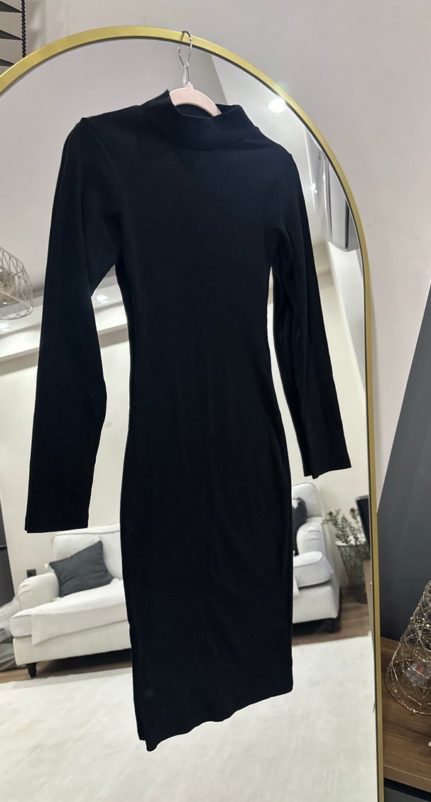 Siyah renkte, yüksek yakalı ve uzun kollu bu uzun elbise, vücuda oturan kesimiyle dikkat çeker. Düz ve pürüzsüz sentetik kumaştan üretilmiş, ofis ve sokak stiline uygun şık bir modeldir. Omuzdan etek ucu boyu 100 cm Kolaltı eni 30 cm