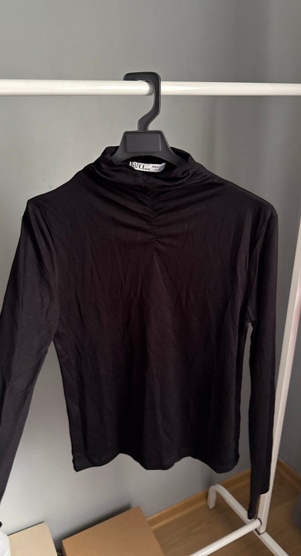 Siyah renkte, yüksek yakalı ve uzun kollu, vücuda oturan kesime sahip kadın triko. Yumuşak keten kumaştan üretilmiş, minimalist ve şık sokak stiline uygun, günlük kullanıma ideal.