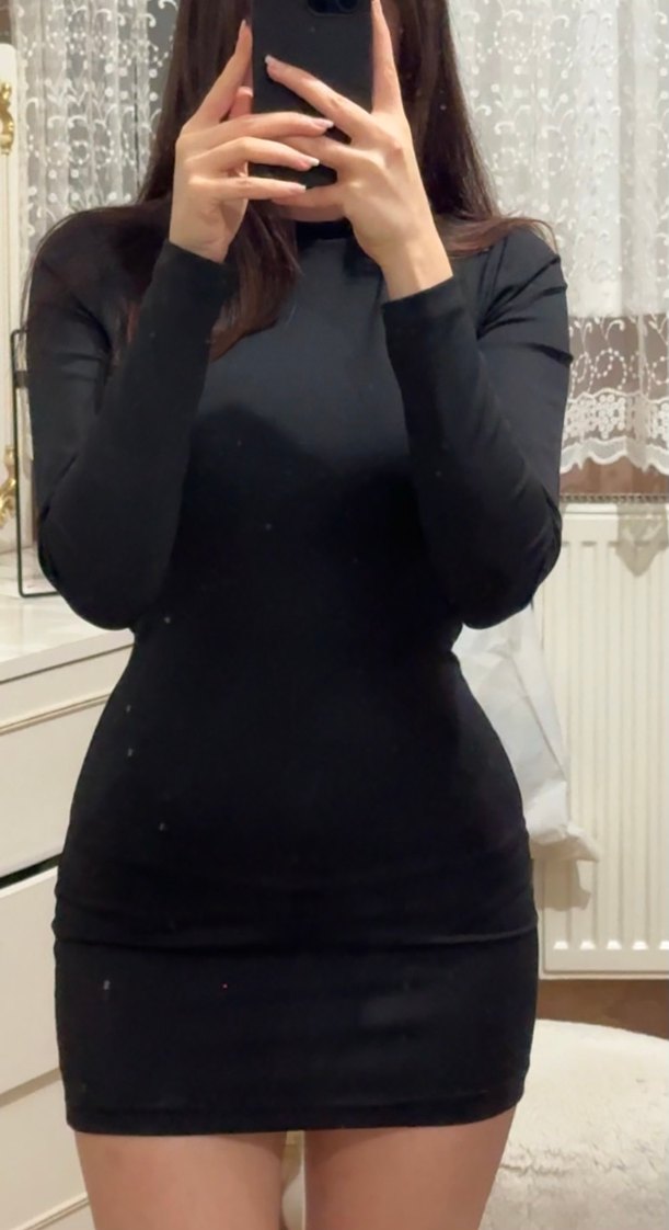 Siyah Yüksek Yakalı Uzun Kollu Midi Elbise