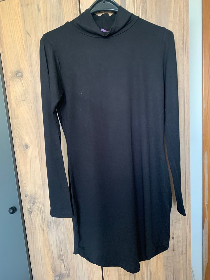 Siyah, uzun kollu ve yüksek yakalı, yumuşak ve sıcak kumaştan yapılmış normal kesim elbise, Desensiz ve goth athleisure tarzına uygun.