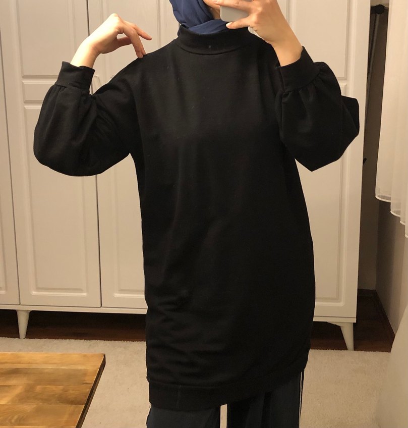 Siyah renkte, yüksek yakalı ve uzun kollu sweatshirt. Rahat kesim yumuşak ve sıcak kumaştan üretilmiştir.