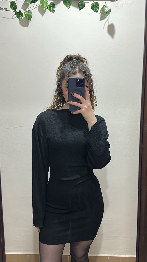 Dar kesim, siyah triko elbise yüksek yakalı ve uzun kolludur. Midi boyda, minimalist ve gotik tarzıyla günlük kullanıma uygundur. Desensiz, sentetik kumaştan yapılmıştır.