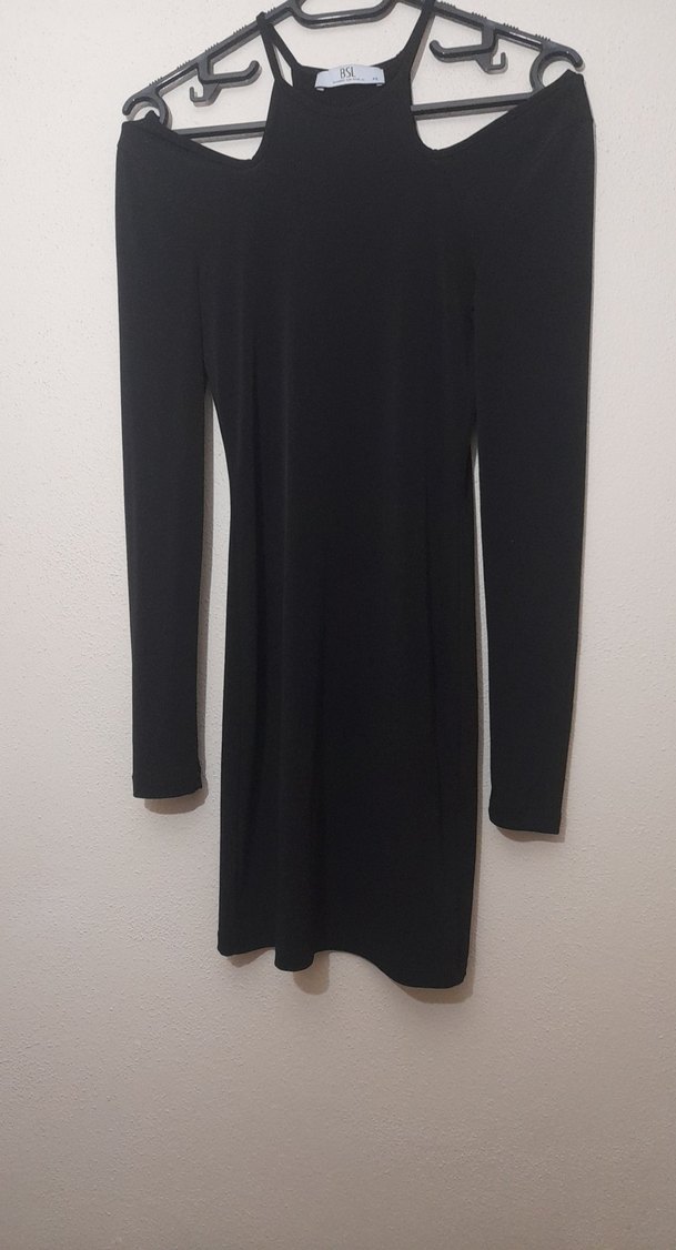 Siyah, yüksek yakalı, uzun kollu ve vücuda oturan midi triko elbise. Minimalist ve gotik tarzıyla ofis için şık ve rahat bir tercih.