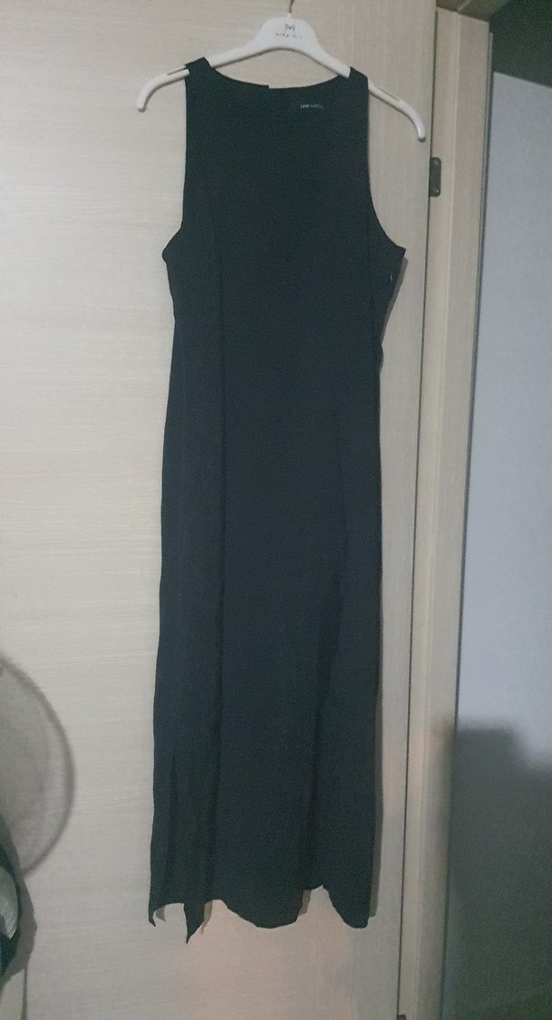 Siyah, kolsuz uzun elbise, yüksek yakalı ve regular fit. Pürüzsüz sentetik kumaştan, minimalist ve şık tarzda, günlük kullanıma uygun.