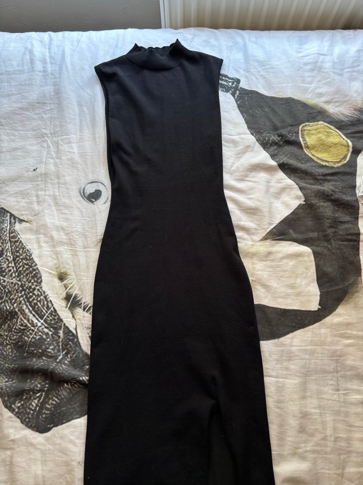Siyah, yüksek yakalı, kolsuz uzun elbise, dar kesim ve yırtmaç detayına sahip, sentetik kumaştan üretilmiştir. Minimalist sokak tarzı için uygundur.