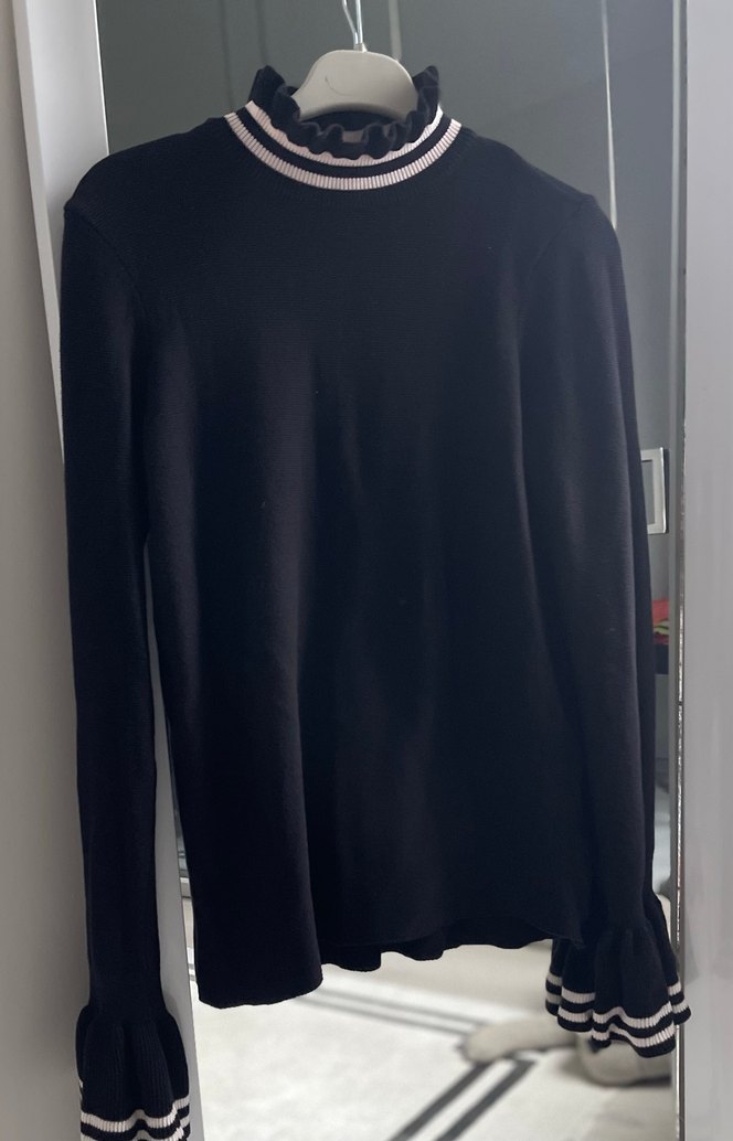 Siyah renkli, yüksek yakalı kadın kazak, uzun kollu ve fırfırlı manşetlere sahiptir. Günlük ve özel günlerde kullanımı için uygun, vücuda oturan normal boyda bir modeldir. Kazak boyu 68 cm
