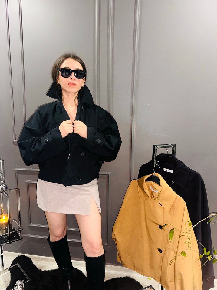 Siyah trenç ceket, yüksek yakalı ve uzun kollu, bol kesimiyle rahat ve şık bir sokak stili sunar. Günlük kullanım için uygundur.