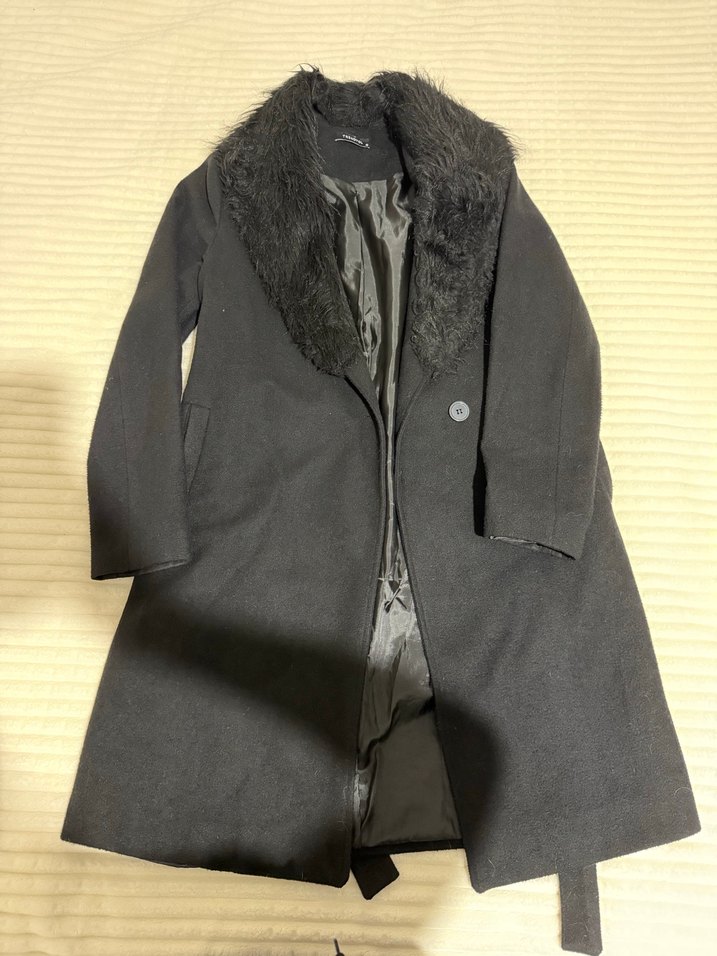 Yumuşak sahte kürk yakalı siyah yün kaban. Saylı kullanıldı sıfır ayarında