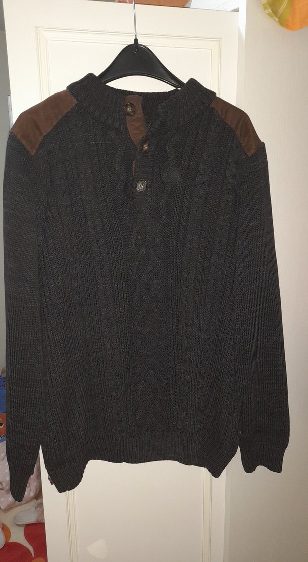 Siyah yün örgü kumaştan, yüksek yakalı ve uzun kollu erkek kazak. Rahat kesim ve deri görünümlü omuz detaylarıyla günlük kullanıma uygun, biker tarzında rahat bir model.