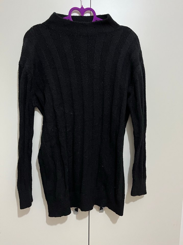 Bu siyah yün kazak, yüksek yakalı ve uzun kollu olup örgü dokudadır. Normal boyu ve dar kesimiyle günlük kullanıma uygundur.