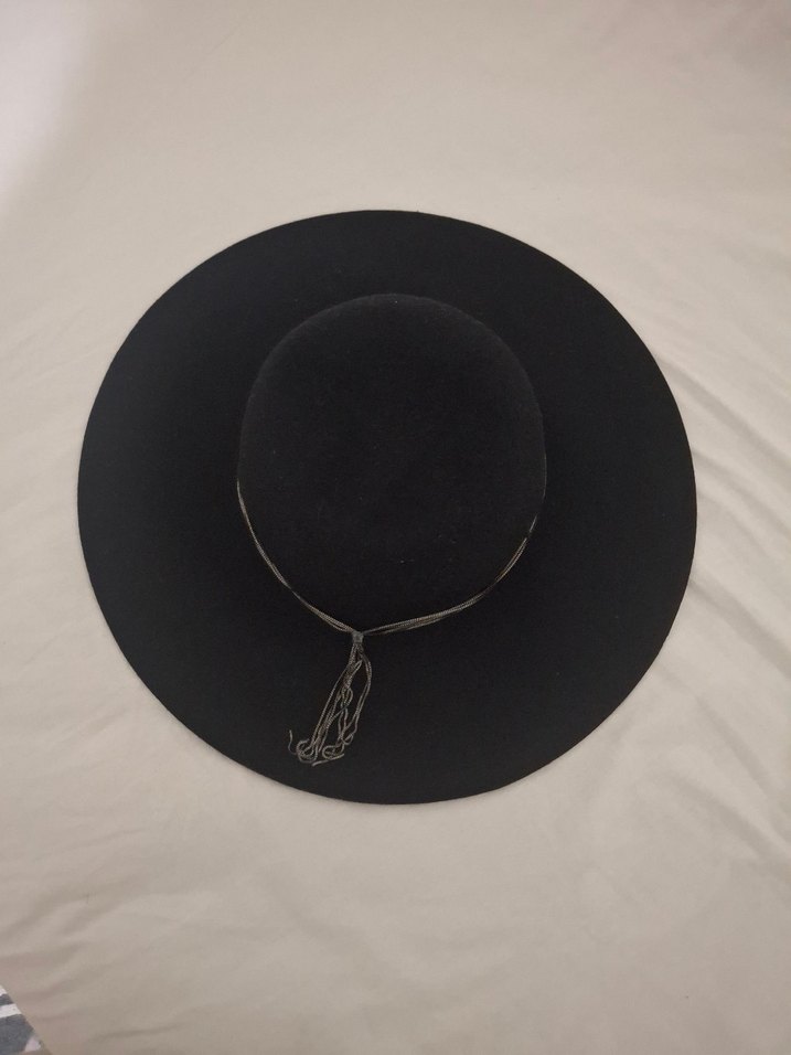 Geniş kenarlı siyah süet kadın şapka, püskül detayıyla gotik tarzda, Paris ve bohem esintili. Hediye gelmişti hiç kullanılmadı etiketi de üzerinde ama ürünün kendi marka etiketi kesik fotoğrafta görünüyor