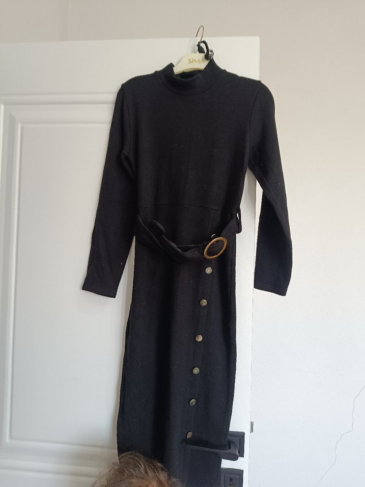 Yün kumaştan kemerli, yüksek yakalı, düğmeli ve uzun kollu siyah uzun elbise. Günlük kullanıma uygun şık ve sıcak bir tasarım.
