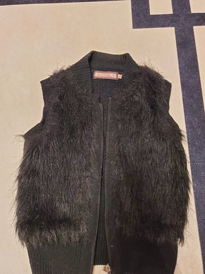 Siyah yün kumaştan, kürk detaylı,kolsuz ve vücuda oturan kesime sahip yelek. 10-11 yaş