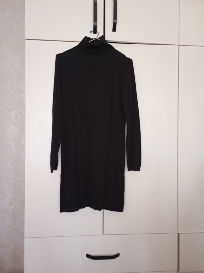 Dar kesim, siyah renkli, uzun kollu ve boğazlı uzun triko elbise. Yumuşak yünden örülmüş minimal ve desensiz tasarım, günlük kullanıma uygundur.