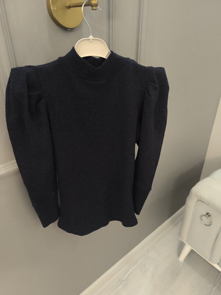 Siyah yünlü kazak, yarım balıkçı yaka ve uzun kollu. Örgü dokusu sıcak ve rahat bir his verir, günlük sokak stili için uygun.