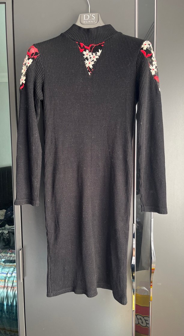 Siyah yünlü, uzun kollu ve yüksek yakalı örgü elbise. Omuzlarda desenli çiçek detayları bulunur, koyu ve gotik tarzda, günlük kullanıma uygun.