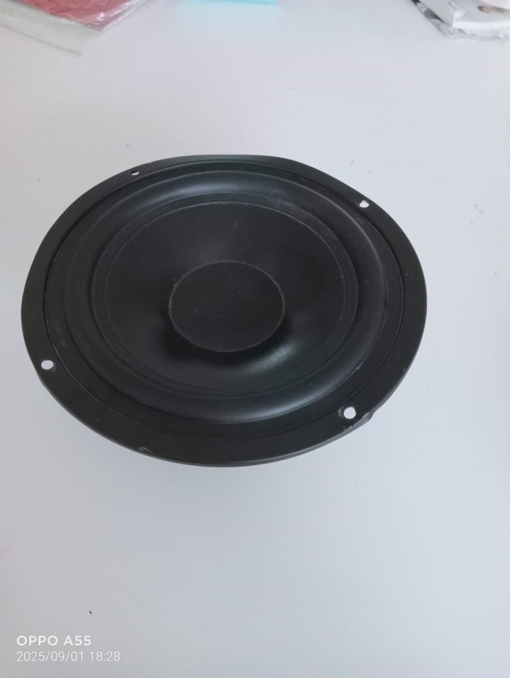 Farklı müzik sistemlerine uyumlu, siyah renkte yuvarlak hoparlör ünitesi.