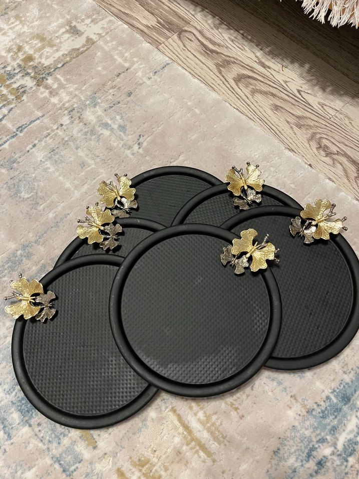 Siyah yuvarlak mat kahve sunumu için tepsi .biraz kullandım mat olduğu için su lekesi bırakıyor yıkadıktan sonra kurularsanız sıkıntı olmaz .makinada yıkanmıyor süslemeleri çok güzel deforme olmadı hiç sadece su lekesi var yıkayıp kurulayıp göndericem size alana şimdiden hayırlı olsun