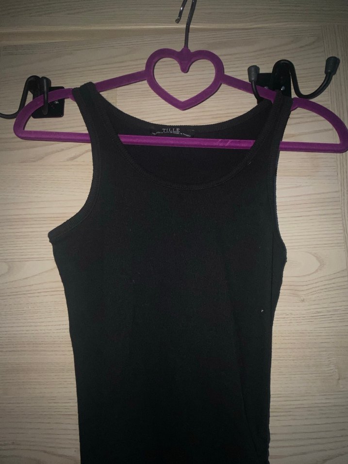 Bu siyah kolsuz kadın elbise, yuvarlak yaka ve vücuda oturan kesime sahiptir. Pürüzsüz sentetik kumaştan yapılmış, minimalist gotik tarzda günlük kullanıma uygundur.