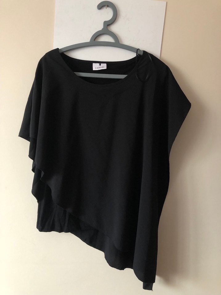 Siyah, kısa kollu, dökümlü, şifon kadın bluzu. Hem günlük hem de gece kullanımı için uygundur. Birkaç kez kullanıldı. Hiçbir kusuru yoktur.
