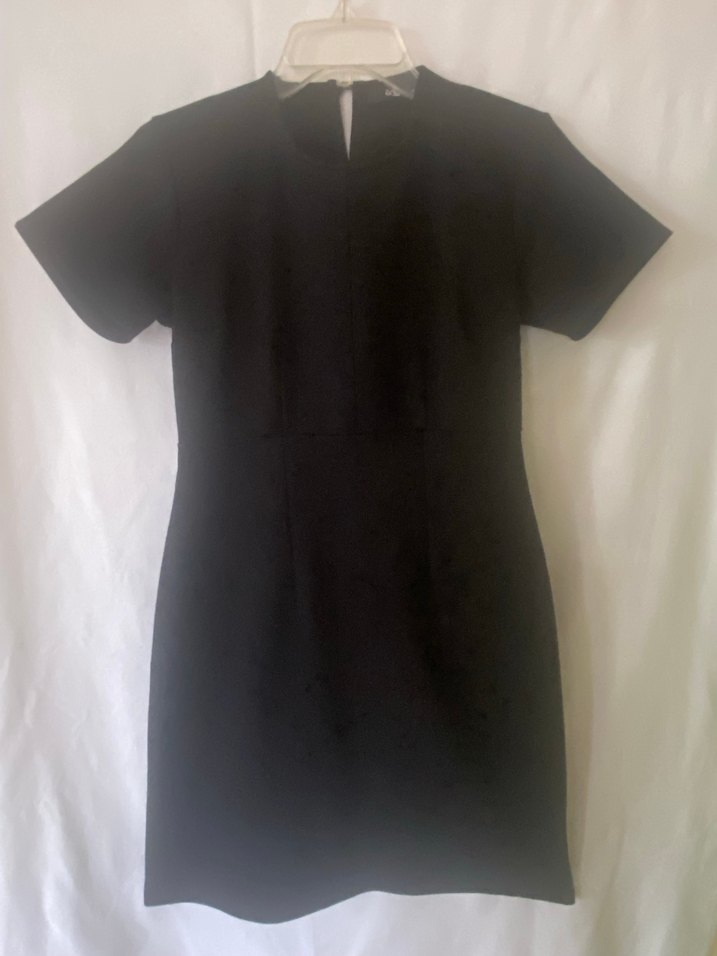 Düz siyah hafif simli ( belli- belirsiz ) elbise, kısa kollu ve yuvarlak yakalı, düz kesimiyle ofis ve akşam yemekleri için uygun, polyester ve Viscose kumaştan yapılmıştır.