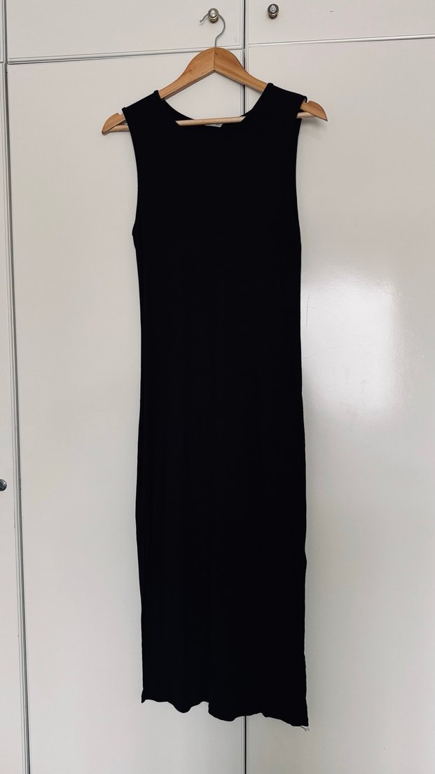 Siyah, yüksek yakalı, kolsuz uzun elbise, vücuda oturan kesimi ve sade tasarımı ile minimalist tarzı sunar. Yazlık elbisedir
