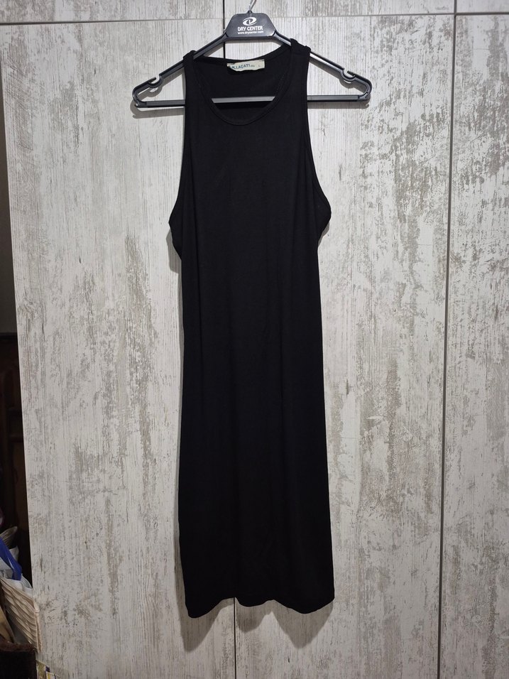 Siyah, yuvarlak yakalı, kolsuz ve vücuda oturan uzun elbise. Minimalist ve goth tarzıyla günlük kullanım için zahmetsiz şıklık sunar.