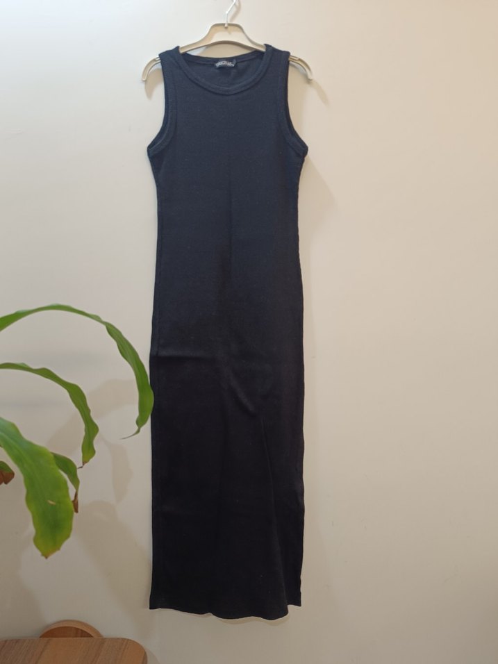 Siyah, kolsuz ve yüksek yakalı bu elbise, vücuda sıkmayan esnek kesimi ve yumuşak penye kumaşıyla minimalist ve şık bir görünüm sunar. Günlük kullanım için uygundur. az kullanılmış tertemiz marka temsili