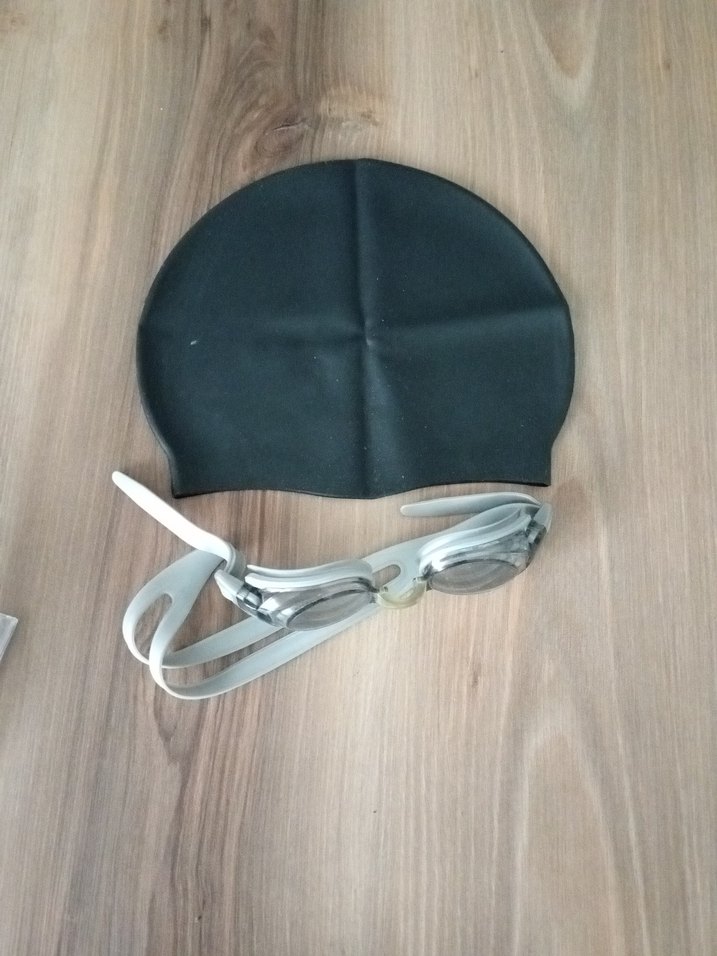Siyah yüzme bonesi ve elastik bantlı gri yüzme gözlüğü, sade ve sportif kullanım için uygun, vücuda oturan tasarım.