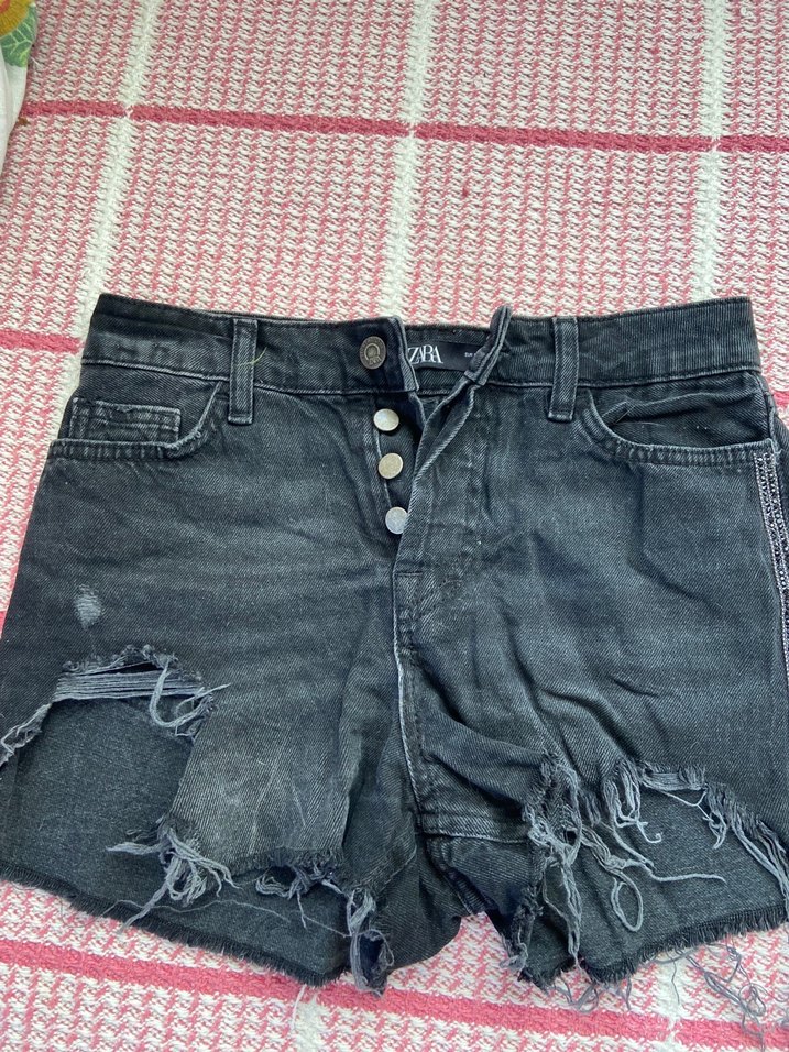 Düğmeli, salaş kesim gri kot şort, yırtık detaylarıyla grunge punk tarzını yansıtıyor. Günlük rahat kullanım için uygun. #zara #şort