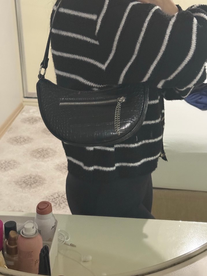 Siyah deri kadın çanta, zebra desenli ve fermuarlı cepli, trend sokak modası için uygun.