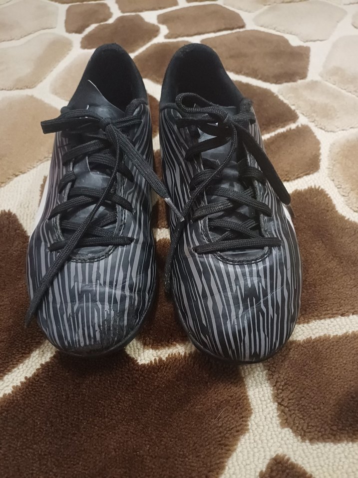 Siyah zebra desenli erkek futbol ayakkabısı, kauçuk tabanlı,bağçıklı. Sokak stili ve spor için uygundur. ⚽önünde deformasyonu var.