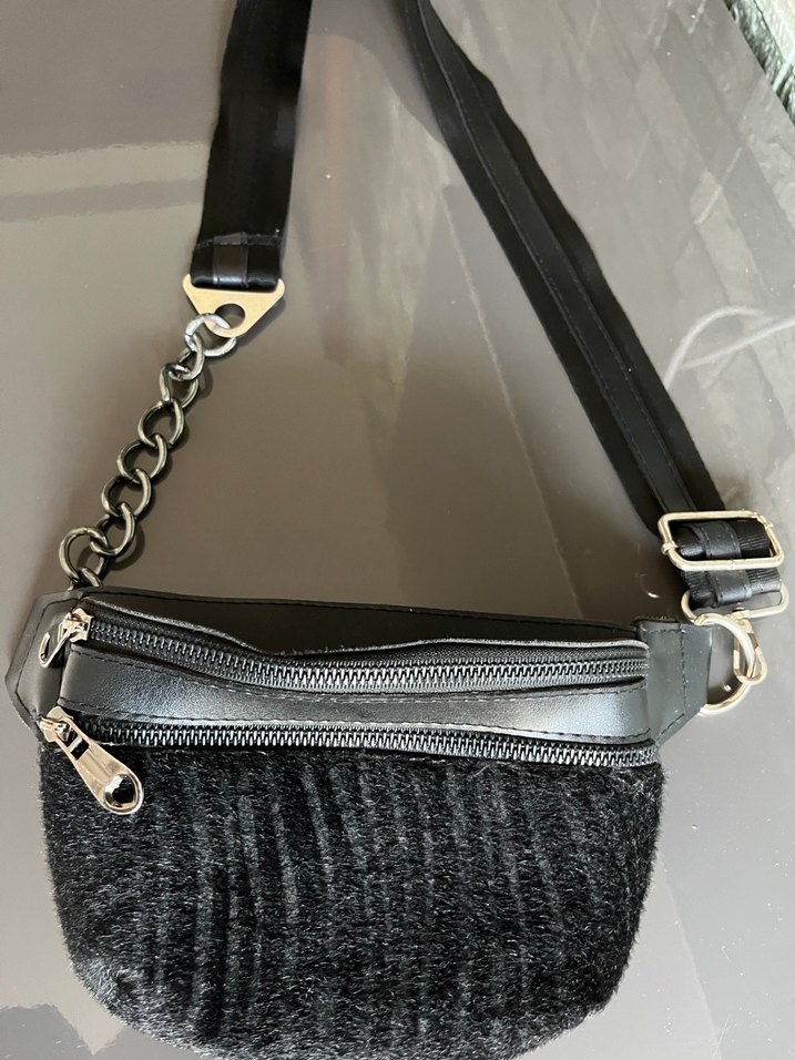 Siyah zebra desenli, kemerli kayışa sahip kadın çapraz çanta. Sentetik kumaştan üretilmiş, günlük sokak stili için uygun.