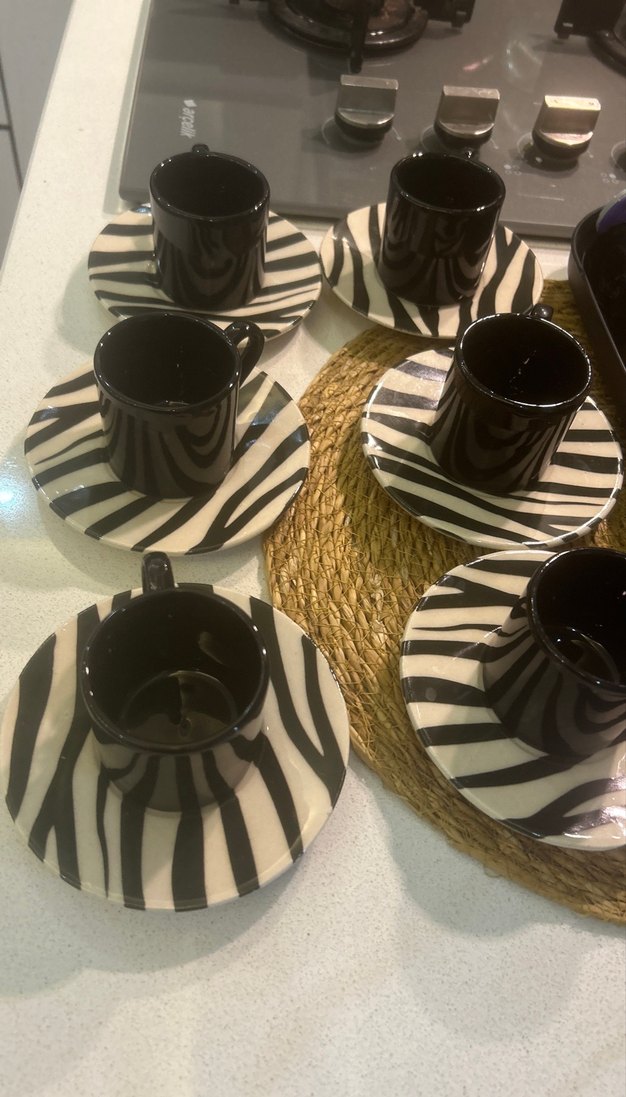 Siyah renkli kahve fincanları, siyah-beyaz zebra desenli tabaklarla tamamlanmıştır. Parlak yüzeye ve küçük boyuta sahiptir.