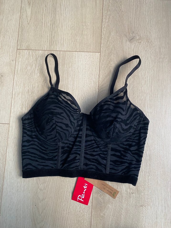 Siyah zebra desenli, ince askılı ve straplez kesime sahip mini büstiyer. Sentetik kumaştan, sokak stili ve dış mekan kullanımı için uygun. Etiketli ve hiçbir sorunu yok. 75B. Desteksiz.