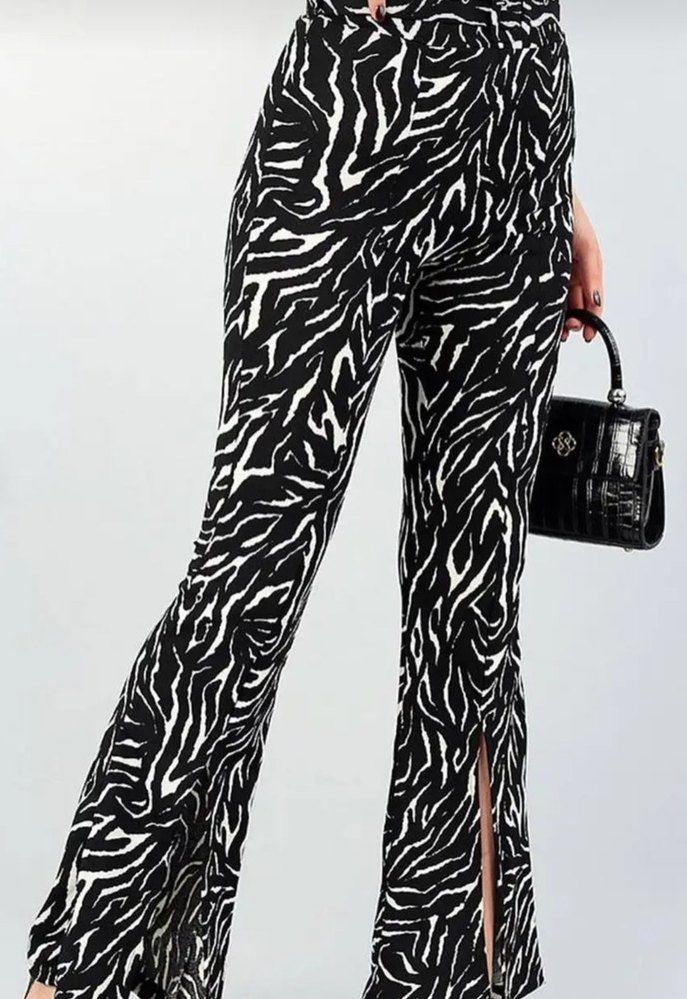 Siyah zebra desenli, pilili, uzun paça, sentetik kumaştan yapılmış kadın ispanyol paça pantolon. Sokak stili ve günlük kullanım için uygun.