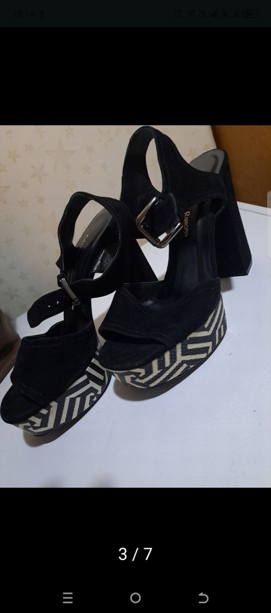 Lastik tabanlı, zebra desenli siyah platform topuklu ayakkabı, tokalı kayış detaylıdır. Çağdaş sokak stiline uygundur. Sadece bir kez iki saatliğine düğün de giydim Yeni temizdir.