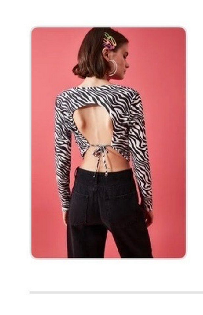 Zebra desenli, sırtı açık bağcıklı mini bluz.