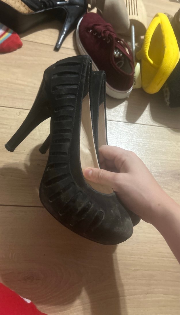 Kauçuk malzemeden yapılmış, zebra desenli ve tokalı siyah stiletto topuklu ayakkabı. Gotik ve avangart tarzda, romantik akşamlar için uygun.
