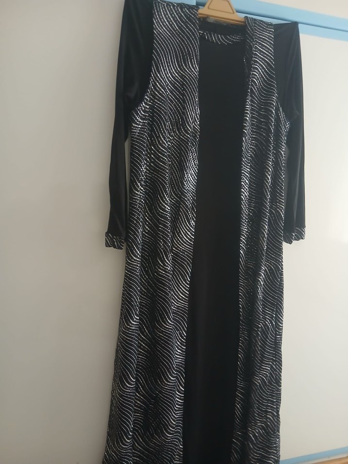 Zebra desenli, drapeli uzun siyah elbise. Yüksek yakalı, uzun kollu ve bol kesimdir, avangart tarz için uygundur. Sadece bir kez giyildi yeniden farksız